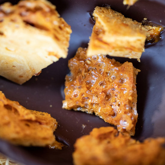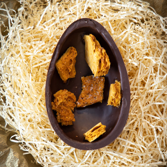 The luxury egg comes with 4 Bee my Honey chocolates from the Grá Chocolate box. Bubbly honeycomb pieces are expertly made and brought to the perfect stage of caramel. As well as the crunchy pieces we add Sliabh Aughty Honey from Co. Galway and a luscious honey ganache. All encased in a rich dark chocolate shell.