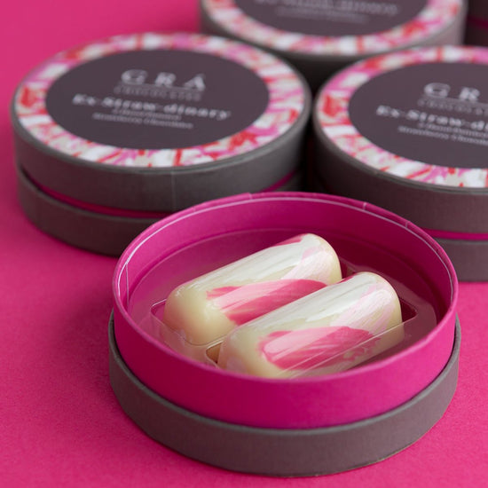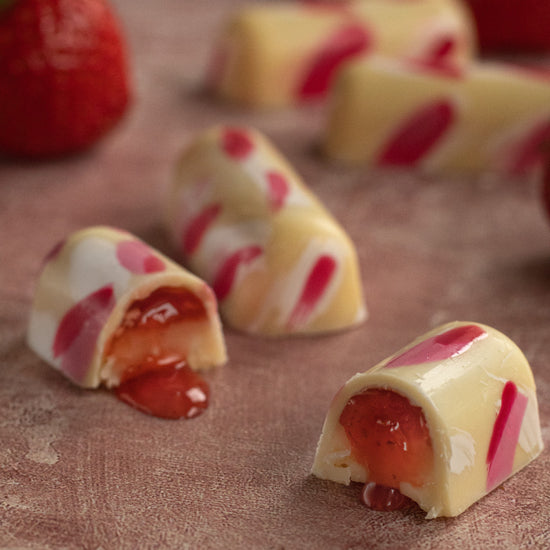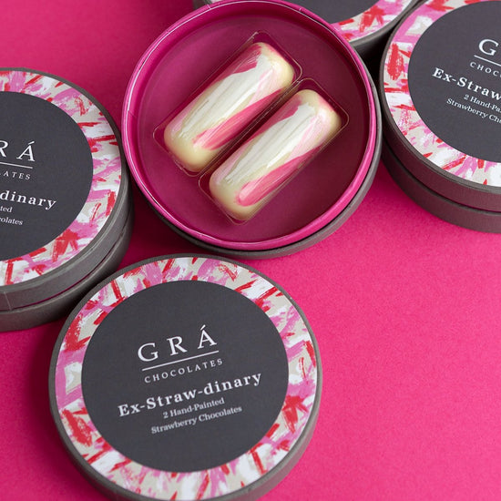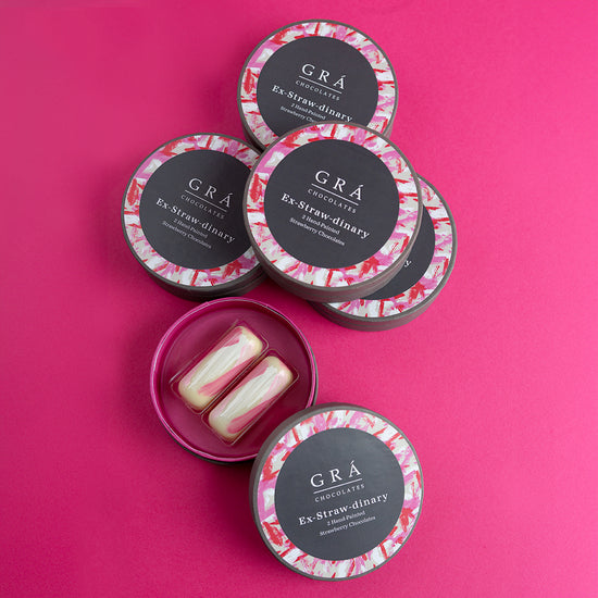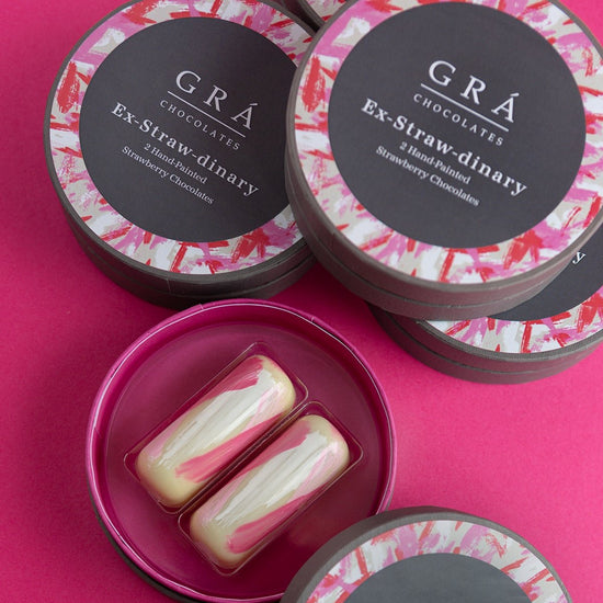 Ex-Straw-dinary from the The Grá Chocolates Box, Gooey strawberry compot paired with a beautiful white chocolate ganache made with Irish Cream. Rich and creamy white chocolate paired with the acidity of the strawberries is a match made in heaven.