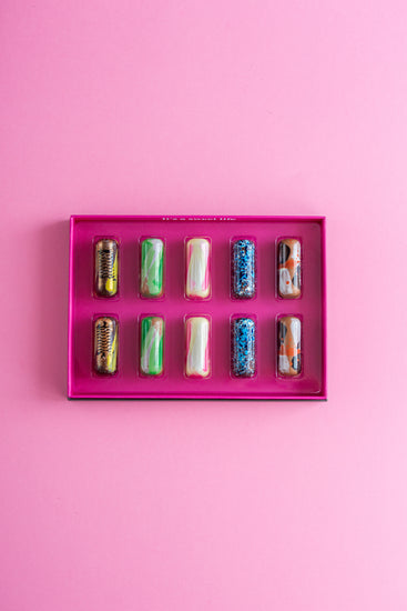 Box of 10 hand-painted chocolates with original fillings. In each box, there will be 5 varieties, 2 of each flavour. A perfect gift for any chocoholic!