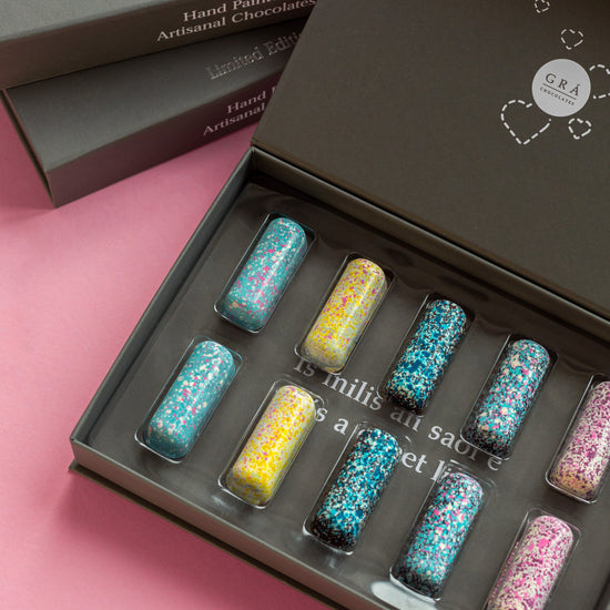 Each individual chocolate is carefully hand painted, and are filled with delicious centres. The combination of flavours and textures are created for your satisfaction. Attention to detail is of utmost importance to ensure your enjoyment of rud éigin milis (something sweet).